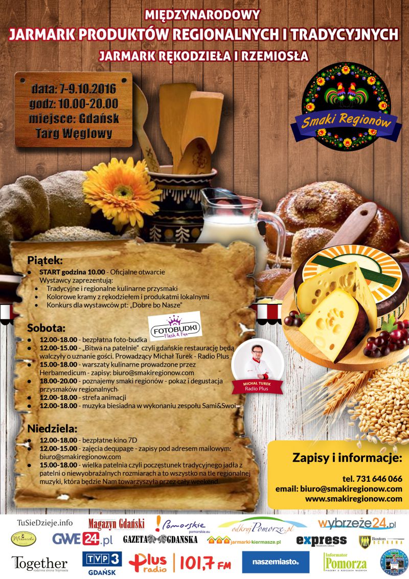 Już w piątek, 7 października, w Gdańsku rozpoczął się Międzynarodowy Jarmark Produktów Regionalnych i Tradycyjnych, Jarmark Rękodzieła i Rzemiosła. Obecność na nim zapowiedziało około 60 wystawców, zarówno z Polski, jak i z Europy, którzy prezentują regionalne i tradycyjne produkty kulinarne. W barwnych kramach można znaleźć m.in. miody, sery, wędliny, chleby i napitki regionalne, a także rękodzieło i produkty rzemieślnicze.