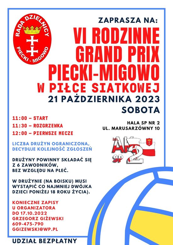 Wraz ze Szkoła Podstawowa nr 2 z oddziałami sportowymi im. Armii Krajowej zapraszamy na VI RODZINNE GRAND PRIX PIECKI-MIGOWO W PIŁCE SIATKOWEJ - 21.10.2023.